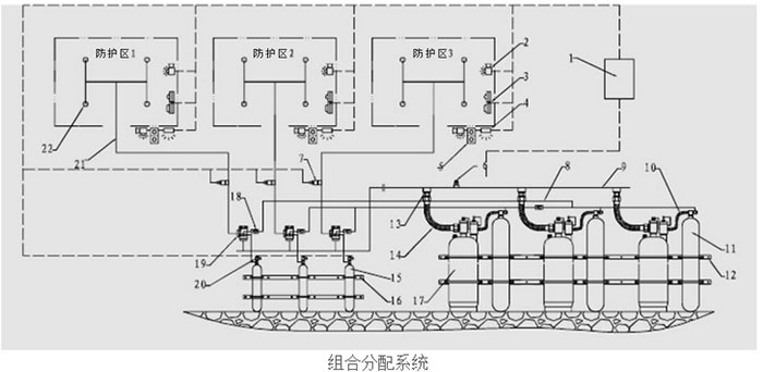 1.气体灭火控制器2.声光报警器3.火灾探测器4.放气指示灯5.紧急启停/手自动转换6.安全泄放阀7.压力信号发生器8.控制连接管9.集流管10.动力气连接管11.动力气瓶组12.灭火剂瓶组支架13.灭火剂单向阀14.灭火剂连接管15.启动气瓶组16.启动气瓶组支架17.灭火剂瓶组18.启动气体单向阀19.选择阀20.电磁启动器21.管网22.喷嘴