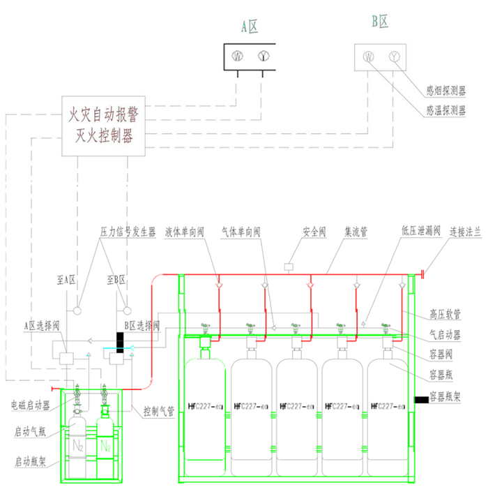 七氟丙烷自动灭火系统具有自动、手动、机械应急操作三种启动方式。 自动状态下,若某防护区发生有烟雾(或温度上升),该防护区的感烟(或感温)火灾探测器动作并向火灾报警控制器送入一个单一火警信号,控制器即进入单一火警状态,同时驱动电动警铃发出单一火灾报警信号,此时不会发出启动灭火系统的控制信号。随着该防护区火灾的蔓延,温度持续上升(或烟雾增大),另一回路的感温(或感烟)火灾探测器动作,向控制器送入另一个单一火警信号,控制器立即确认发生火灾,同时发出复合火灾报警信号及联动信号(关闭空调、送排风装置和防火阀,防火、防火卷帘等)。经过30秒时间的延时,控制器输出信号启动灭火系统,灭火剂经管网施放到该防护区实施灭火。控制器接受到压力信号器的反馈信号后显亮放气指示灯,避免人员误入。手动状态下,报警控制器在火灾发生时只发出火灾报警信号而不产生联动。
