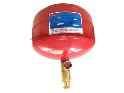 贮压悬挂式干粉灭火装置灭火装置主要由贮粉罐、喷头、压力指示器、感温玻璃球(易熔合金)、吊环等组成。见图1贮压悬挂式干粉灭火装置罐内充装ABC超细干粉灭火剂,驱动气体为氮气。